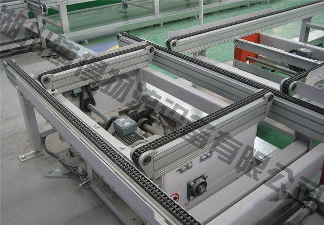 頂升移行機(jī),其結(jié)構(gòu)主要由滑撬、頂升框架、頂升連桿機(jī)構(gòu)、頂升電機(jī)、移行雙鏈、移行電機(jī)組成,滑撬放置在移行雙鏈上,移行雙鏈固定在頂升框架上,頂升電機(jī)通過頂升連桿機(jī)構(gòu)與頂升框架依次連接成一個整體,移行電機(jī)固定在移行雙鏈的一側(cè)。優(yōu)點:具有較強(qiáng)的靈活性和互換性;用連桿機(jī)構(gòu)代替常用的鏈傳動結(jié)構(gòu),使傳動鏈更加簡潔,可有效提高傳動效率、降低運(yùn)行噪音。頂升電機(jī)提供設(shè)備頂升的動力,無需用氣。簡化車間管路和氣源點的布置;移行雙鏈起輸送滑撬的作用,它能夠?qū)⒒似椒€(wěn)移行到其它設(shè)備上;移行電機(jī)給移行雙鏈提供所需的動力,以實現(xiàn)滑撬的移行過渡;可通過電氣檢測開關(guān)檢測轉(zhuǎn)臂的不同位置來實現(xiàn)頂升機(jī)構(gòu)的到位檢測,無需再安裝輔助的發(fā)號裝置。